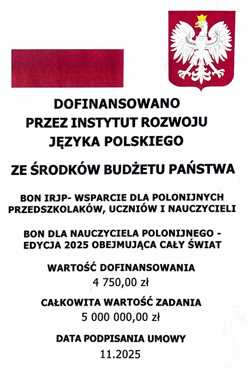Polska Szkoła im. Marii Konopnickiej, Brooklyn otrzymała w roku 2025 Bon nauczyciela. Dziękujemy za wspieranie polonijnego szkolnictwa.