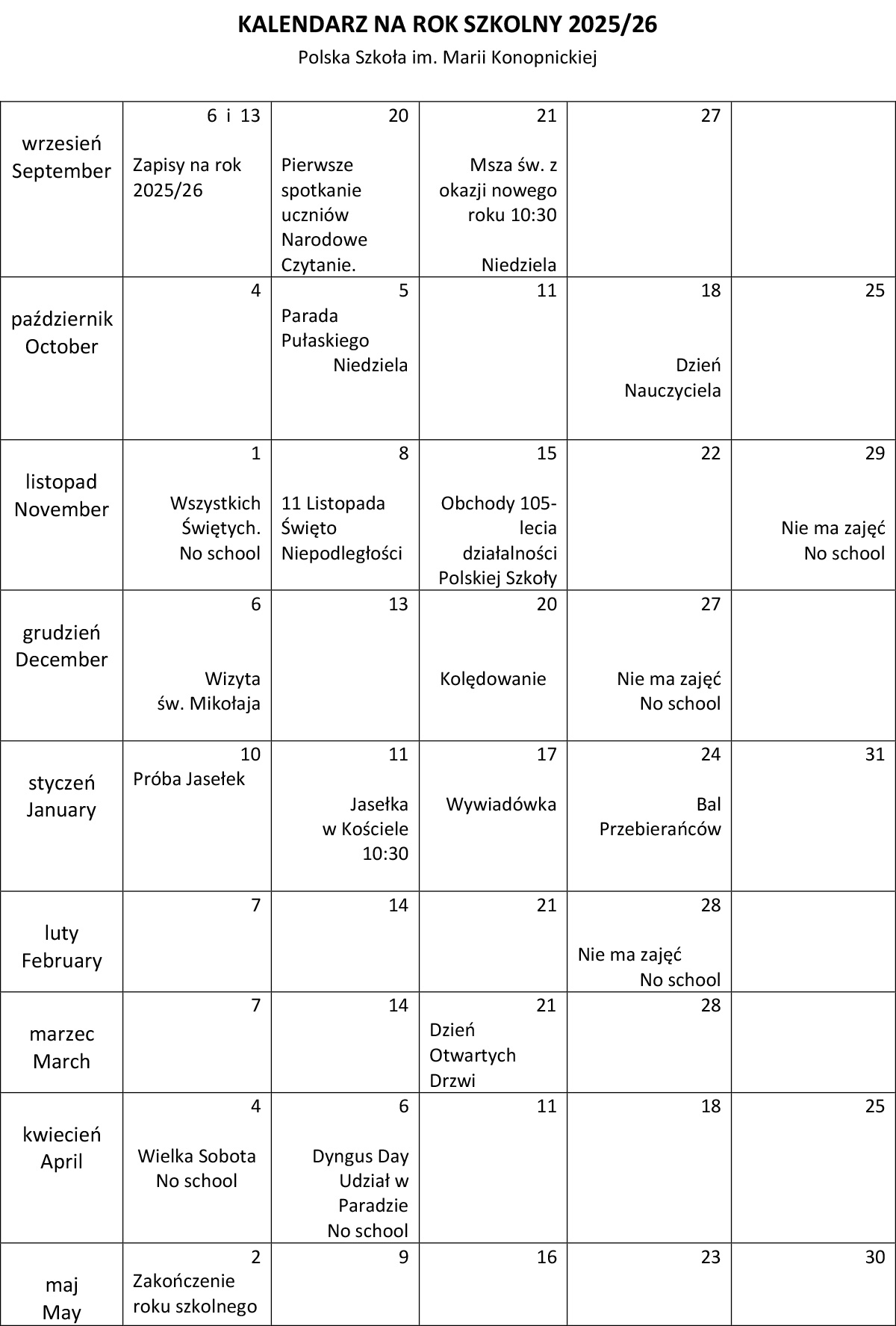 - 15 listopada 2025 r. 105-lecie Polskiej Szkoły im. Marii Konopnickiej